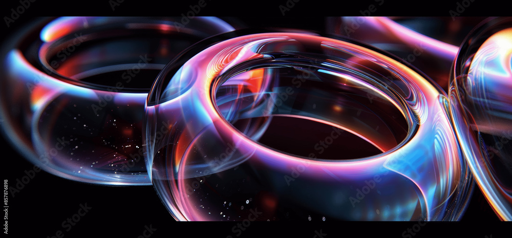 3D Render of Abstract Iridescent Glass Rings on Black Background, Minimalist Texture and Fashion Concept Art in High Resolution