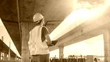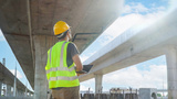 Asian construction supervisor wearing a laptop inspects construction work highway road bridge