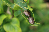 Two brown Marmorated shield bugs on a gren Lilac leaf. Halyomorpha halys insects in the garden