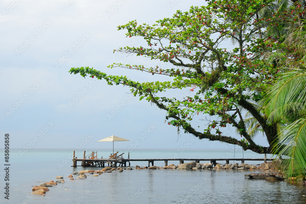Wooden bridge into the sea in summer time