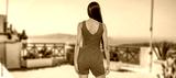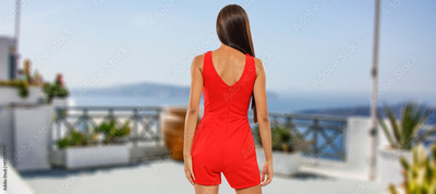 Young woman in summer red pantsuit walking along concrete terrace of the building seen from behind. In the background beautiful seascape, sunny and hot summer day