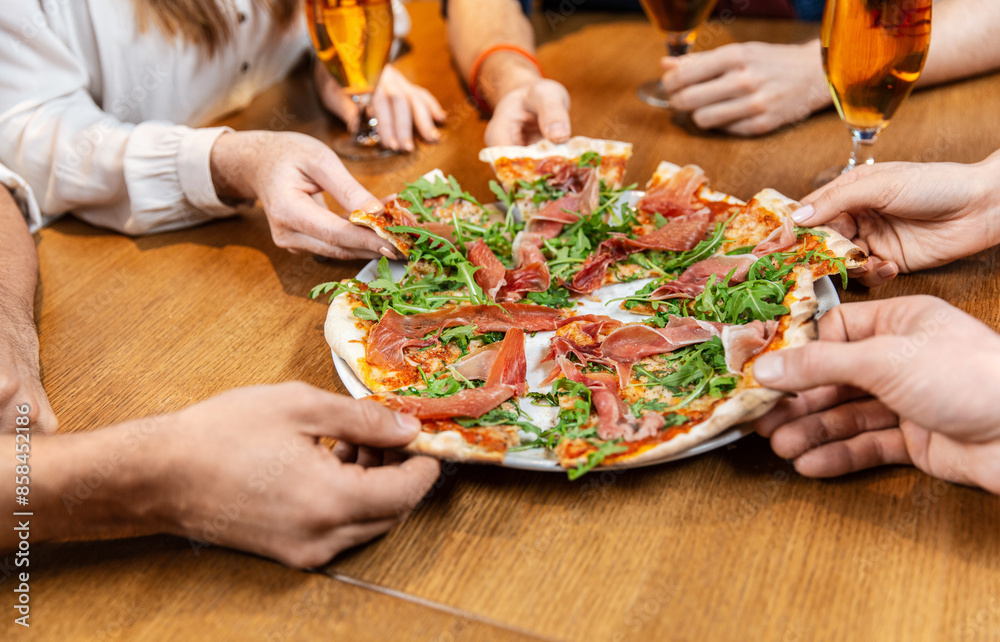 leisure, food and drinks, people and holidays concept - close up of friends eating pizza and drinking beer at restaurant or pub