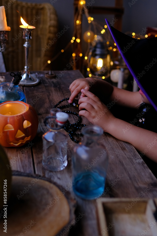child makes magic out of focus, girl 3 years old in witch hat learns skill of magic at school of wizards, Halloween holiday, pumpkin jack with candle, magical attributes, development of imagination
