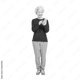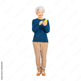 笑顔でスマホを使うシニア女性 手作業で精密に切り抜いた背景透過全身写真PNG