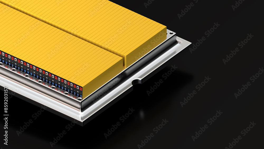 Prismatic High-capacity Battery pack for electric vehicles, LFP cell modules on aluminum platform, mass production accumulators high power and energy, electric vehicles and energy storage, 3d render