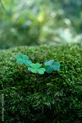 three-leaves oxalis plant grow in moss close up. nature green background. forest wild flora life
