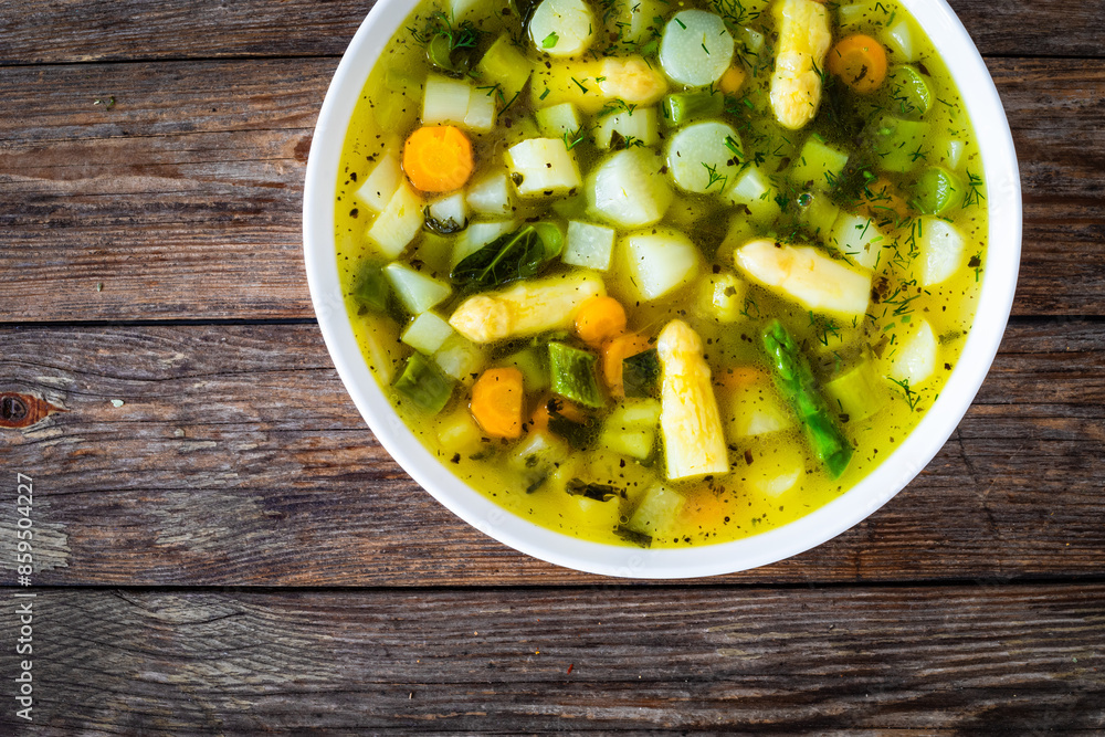 Asparagus soup in white bowl on wooden table
