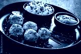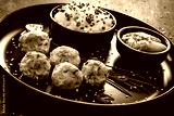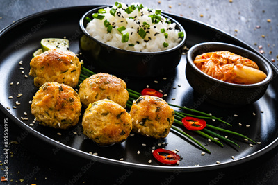 Meatballs served with white rice and kimchi on black plate on black wooden background