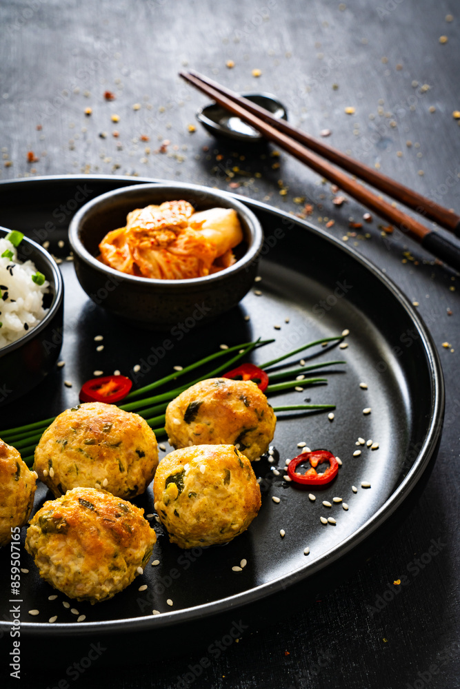Meatballs served with white rice and kimchi on black plate on black wooden background