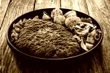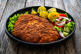 Crispy breaded fried pork chop, boiled potatoes and fresh vegetables served on black plate on wooden table