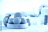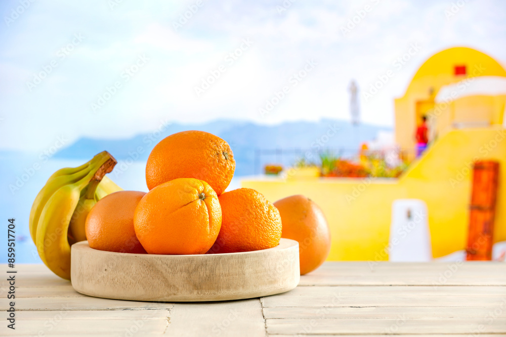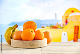 Fresh fruits and oranges on table in front of blue wall with blurred background. summer holiday concept