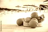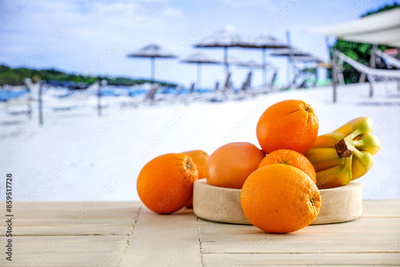Oranges and bananas on wooden table top on the exotic beach. Copy space for drinks and food or products. Hot summer season. Seasonal fruit.