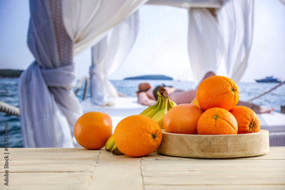 Oranges on wooden table on a boat. A young woman is lying and sunbathing in a white barge boat with curtains.