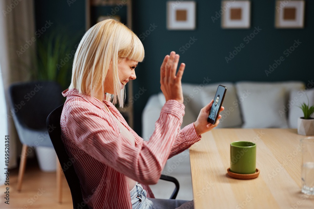 Young woman at the desk with a smile on her face has a video call via smartphone