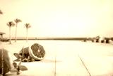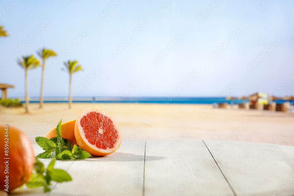 Ripe orange and fresh mint green leaves on the background of the palm trees.