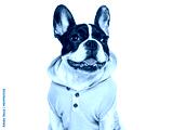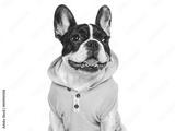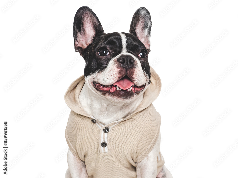 Cute puppy and stylish t-shirt. Isolated background. Closeup, indoors. Studio shot. Day light. Beauty and fashion. Concept of care, education, training and raising pets