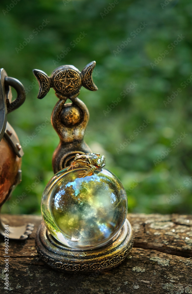 frog on Magic crystal ball, goddess figurine in forest close up, abstract natural background. Witchcraft, esoteric spiritual ritual for relax, meditation. fairytale, mystery