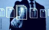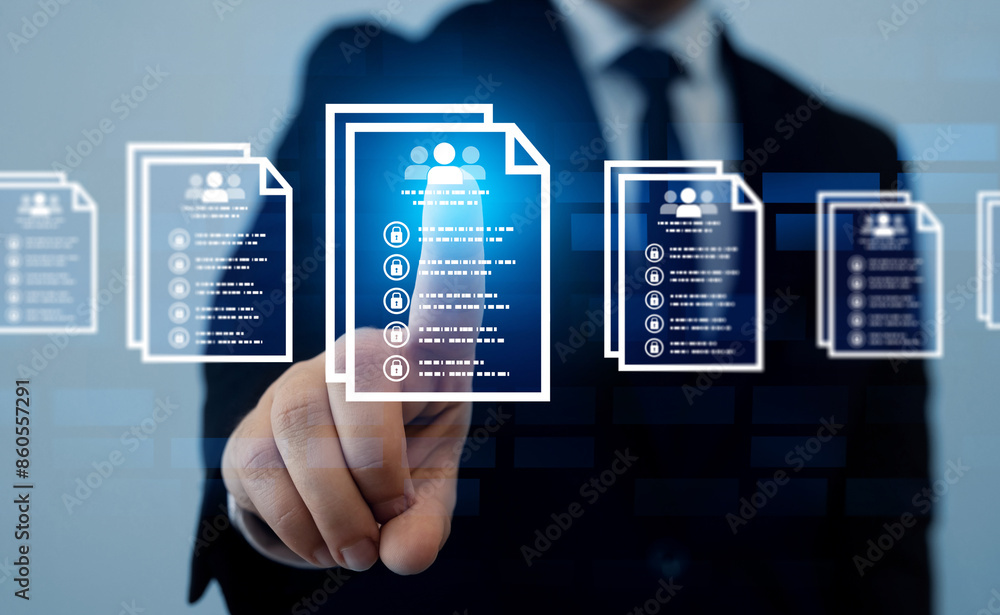Documents confidentiality,cyber security protection concept. Protecting herself from cyber attacks. Software for security, searching and managing corporate document and employee information.