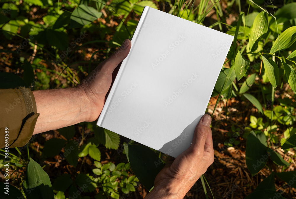 . Male hands holding book hard cover mockup, blank hardcover mock up in nature, green plants.