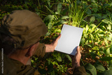 . Man holding book hard cover mockup, blank hardcover mock up in nature, green plants, grass, sunlight.