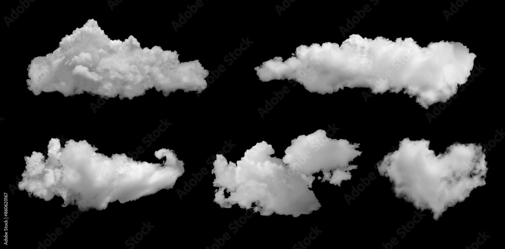 White clouds collection isolated on black background, cloud set on black. fluffy white cloudscape texture. Black sky nature background, cloudy, black and white, horizontal