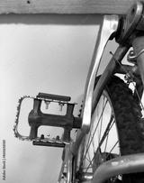 A close-up of the pedal of a bicycle.