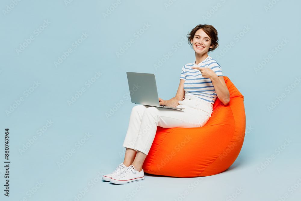 Full body young IT woman wears striped t-shirt casual clothes sit in bag chair hold use work point finger on laptop pc computer isolated on plain pastel light blue cyan background. Lifestyle concept.
