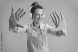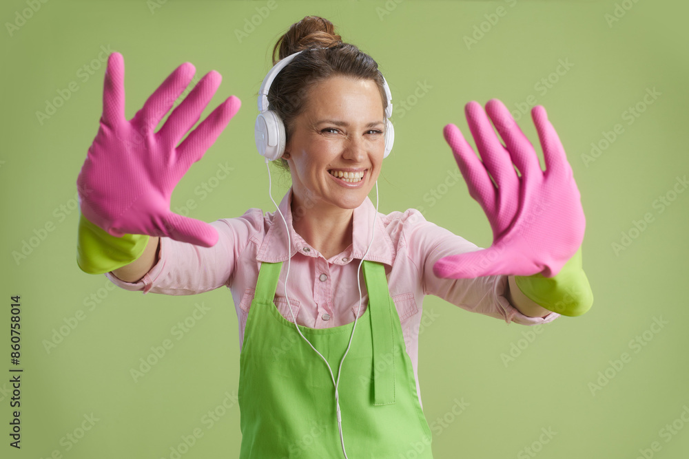 happy housewife showing hands isolated on green