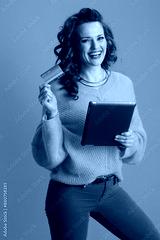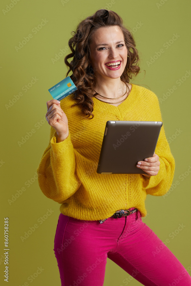 happy trendy woman in yellow sweater on green background