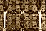 Backside of big LED screen monitor display. Texture of back view panels. Power input and output wire and data input and output plug. Digital electronic screen.