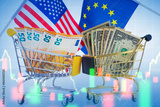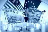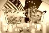 Exchange euros for dollars. US and EU currencies. Money in trolleys from supermarket. Trade relations with European union. US financial market. Exchange American dollars for euros.