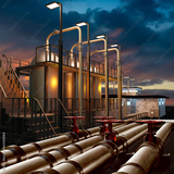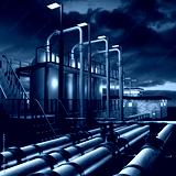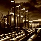 Chemical factory. Exterior of industrial plant. Chemical manufactory in evening. Factories with high pressure tanks. Manufactory with pipeline on site. Chemical plant under night sky. 3d image