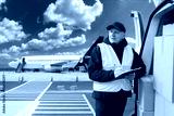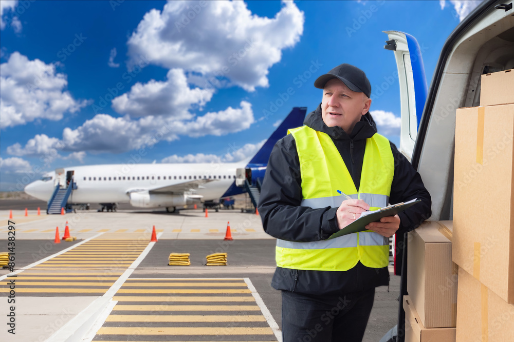 Man airmail representative. Courier and minivan with parcels. Boxes for airmail delivery. Delivery man stands near runway. Airmail courier employee near plane. Air logistics. Courier with clipboard