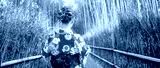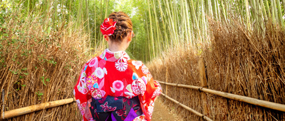 Geisha walks in park. Japanese woman with her back to camera. Geisha in traditional kimono. Girl walks through park in Asia. Geisha stands among tall plants. Woman dressed in Japanese national clothes