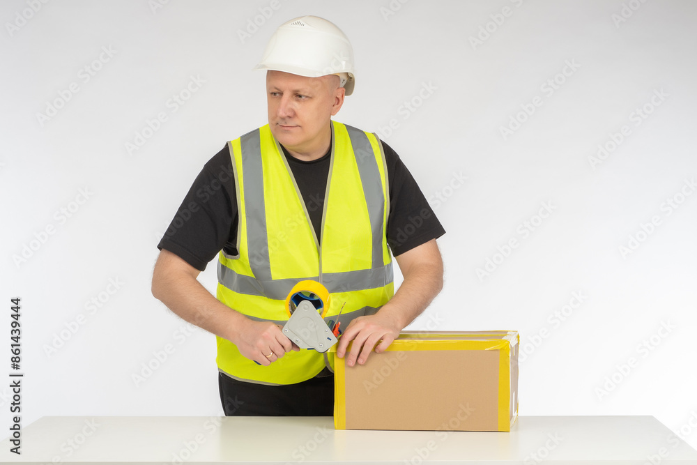 Man parcel packer. Guy seals cardboard box. Packer uses tape dispenser. Contractor prepares package for shipment. Warehouse packer in yellow vest. Man wraps box with tape. Storekeeper at work