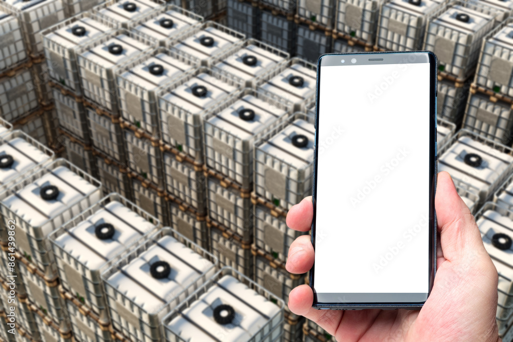 Phone against backdrop of warehouse. Man hand with smartphone. IBC containers. Warehouse with liquid tanks. Phone with copy space. Template for advertising warehouse application. Logistics packaging