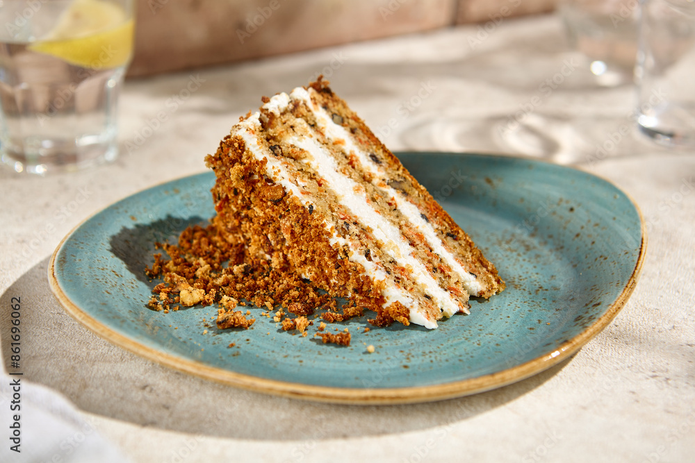 Sunlit Slice of Authentic Carrot Cake on a Beige Table Top