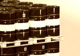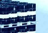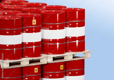 Oil storage barrels. Tanks with chemical fertilizer. Metal barrels on pallets. Oil is ready for transportation. Red barrels isolated. Petroleum products for fuel production. Tanks with oil. 3d image