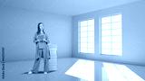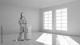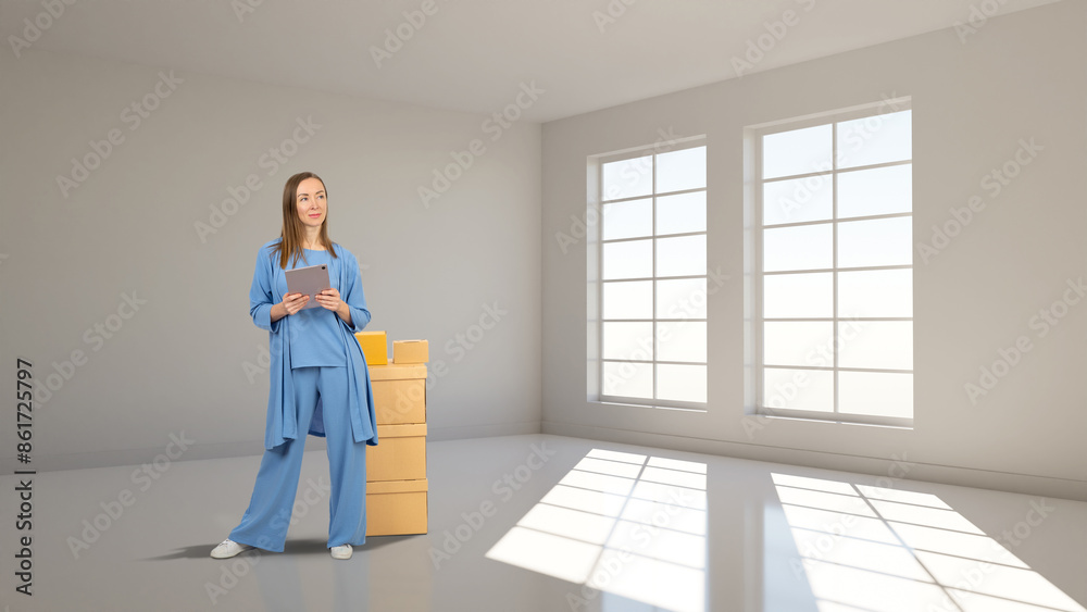 Woman moving into new room. Girl with boxes in empty apartment. Relocation to another accommodation. Woman with boxes for moving. Business lady in empty room. Girl homeowner dreams of renovation