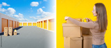 Self storage units. Woman packs boxes. Open air storage units. Street warehouses for safekeeping. Personal storage units. Territory with warehouse premises. Woman with cardboard boxes