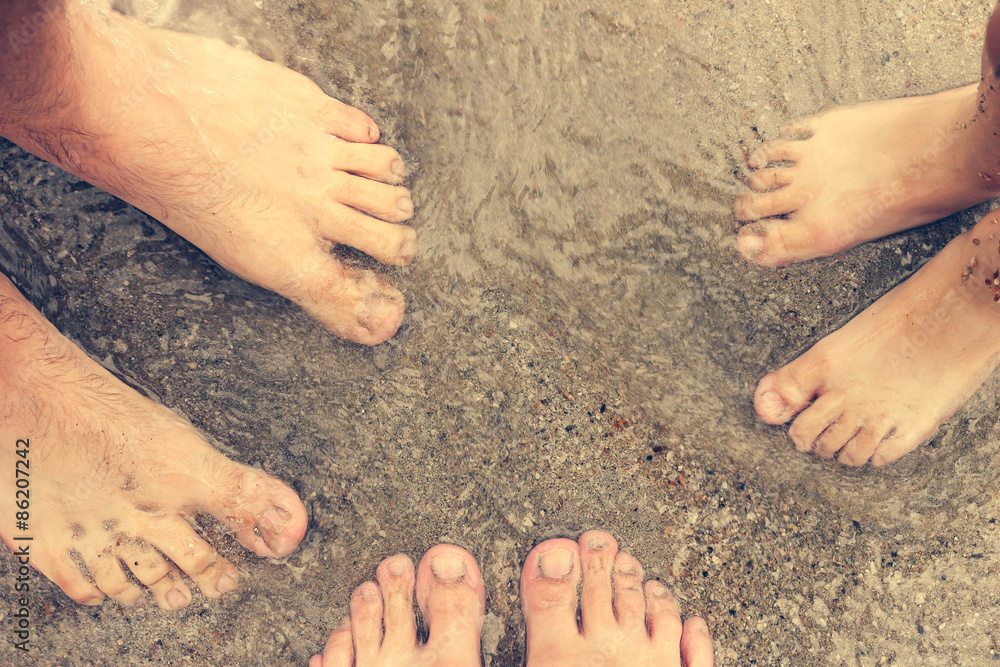 Feet of three people standing in the sea. Family resting on the beach and swimming in the sea.
