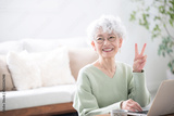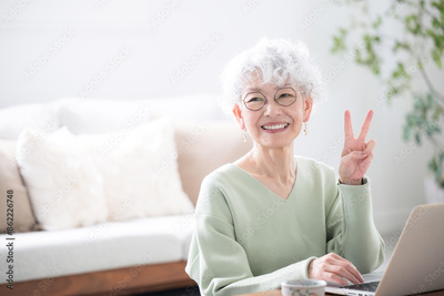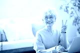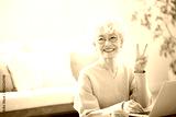 Motivated smiling senior (elderly) woman posing in front of a computer Image of a computer class, etc.