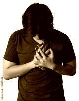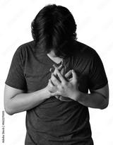 heart disease concept. man pressing on chest with painful expression. severe heartache and having heart attack or painful cramps.