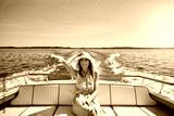 Relax, travel or happy woman on boat on ocean for outdoor vacation or holiday on summer adventure. Cruise, tourist and person with smile, fashion or hat on yacht on sea for weekend trip in Greece