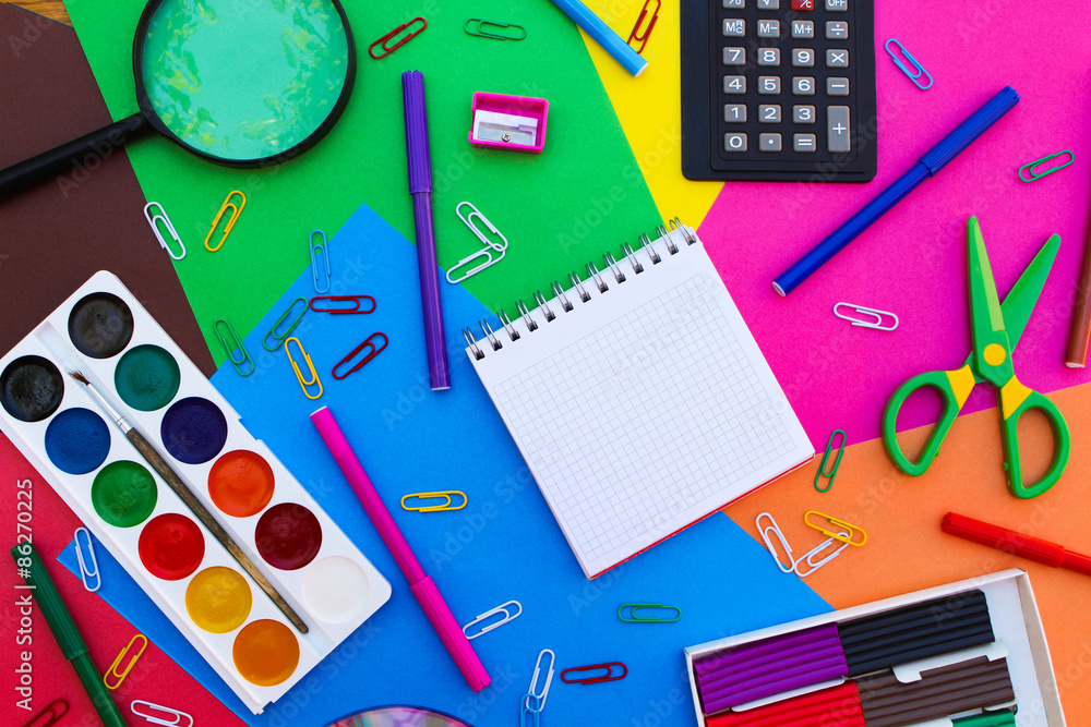 Stationery objects. Office and school supplies on the background of colored paper. back to school.