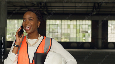 Female Engineer Communicating on Phone at Construction Site Holding White Hard Hat