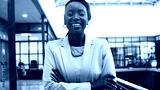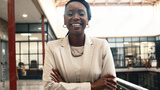 Confident Businesswoman Smiling in Modern Industrial Office Setting