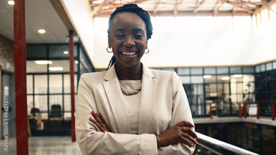 Confident Businesswoman Smiling in Modern Office Space with Industrial Architecture