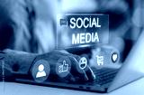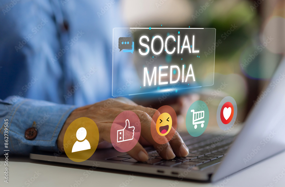 Concept of social media communication and digital online, people use laptop playing with icon online social media, online marketing, technology, chat, post, like, follow at phone screen