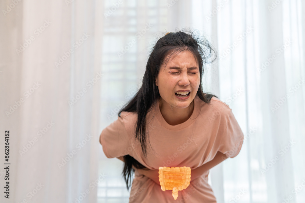 Woman sick unhappy holding belly stomach with suffering from stomach ache pain, monthly period, gastritis, gastroenteritis, food poisoning, diarrhea, intestinal inflammation, Woman healthcare